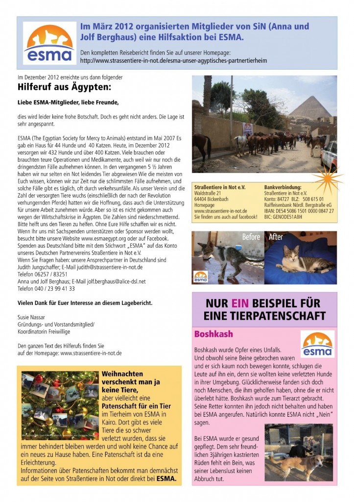 ESMA ist in einer fast ausweglos erscheinenden Lage. Die politische und wirtschaftliche Lage in Ägypten ist schwierig. Die Preise steigen rasant und die Spenden gehen zurück. ESMA finanziert sich aber ausschließlich durch Spenden. Täglich wollen 500 Hunde und 500 Katzen versorgt werden. ESMA braucht dringend Geld um das Tierheim aufrecht zu erhalten, insb. für die Fütterung der Tiere und um den Pflegern ihren Lohn zu bezahlen.